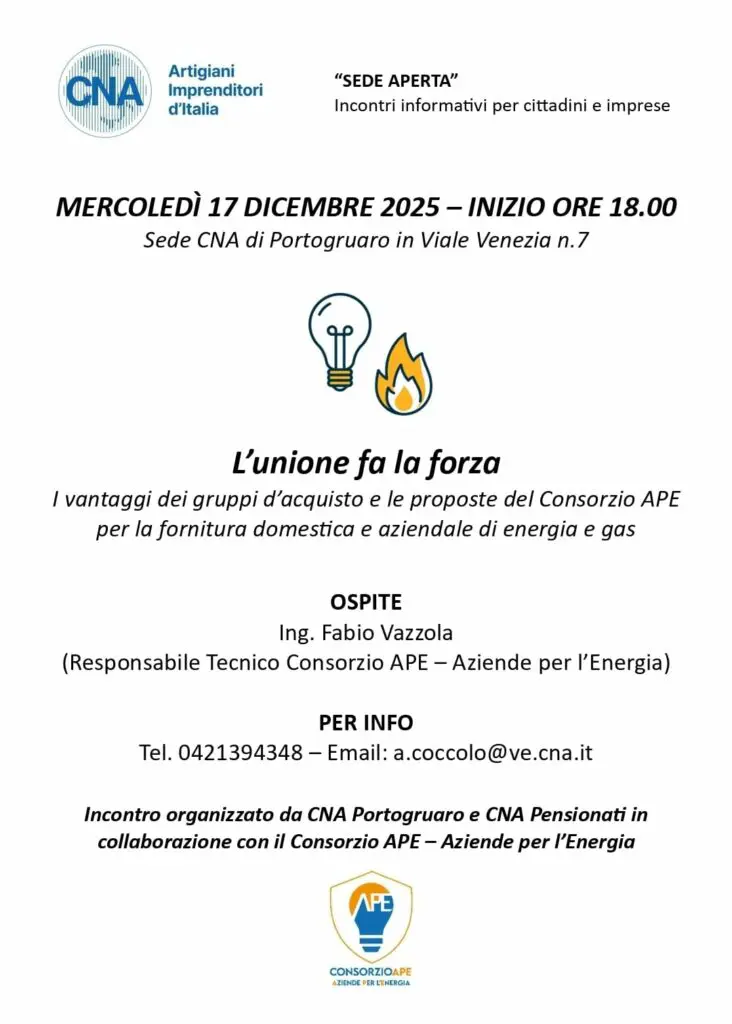 Mercoledì 17 dicembre alle ore 18.00 ospiteremo in sede CNA di Portogruaro un incontro con l’esperto, dedicato al tema dei Gruppi di Acquisto Energia e Gas. Abbiamo invitato in sede l’Ing. Fabio Vazzola, Responsabile Tecnico del Consorzio APE – Aziende per l’Energia, che ci illustrerà i vantaggi dei gruppi di acquisto che consentono ai privati e alle imprese di risparmiare sulle spese di energia e gas. L’incontro, organizzato insieme a CNA Pensionati, è aperto a tutti: privati, pensionati e imprese.